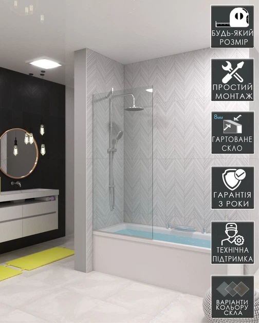 Шторка на ванну 900х1400 мм Atlantis Glass LIGHT LOFT Універсальна з чорною фурнітурою скло графіт