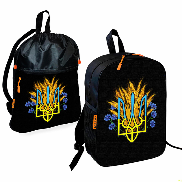 Рюкзак дитячий шкільний 36х27см + Сумка для взуття спортивної форми Тризуб Герб України рюкзак-мішок 43х32см з розширювальни