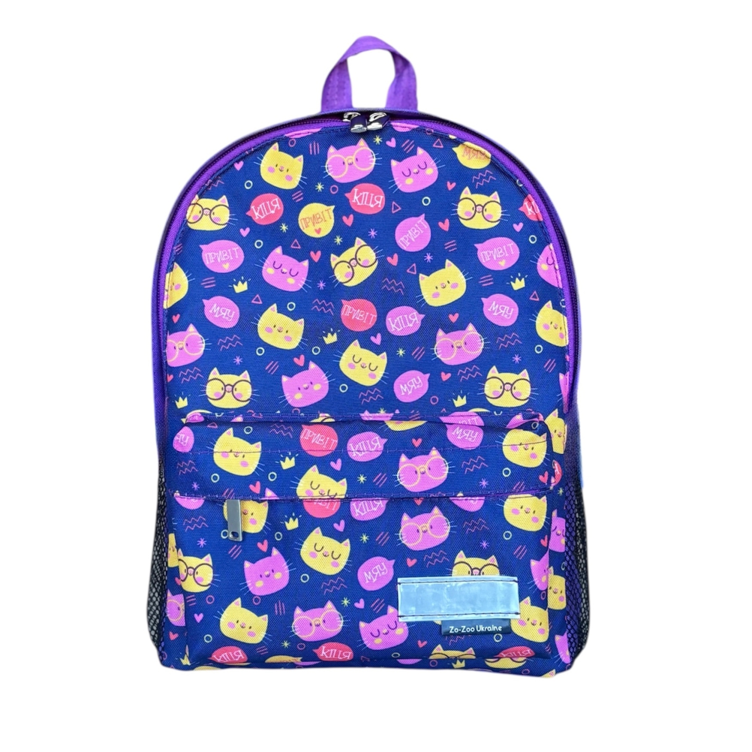 Міський рюкзак Zo-Zoo Котики фіолетовий призначений для повсякденного використання, подорожей, відвідування гуртків та секцій. Особливості: виконаний з щільної водовідштовхуючої тканини; закривається на блискавку, всередині одне містке відділення з м'якою кишенею на спині та двома додатковими кишенями для мобільного телефону та інших дрібниць, підкладка, щільна спинка, м'які