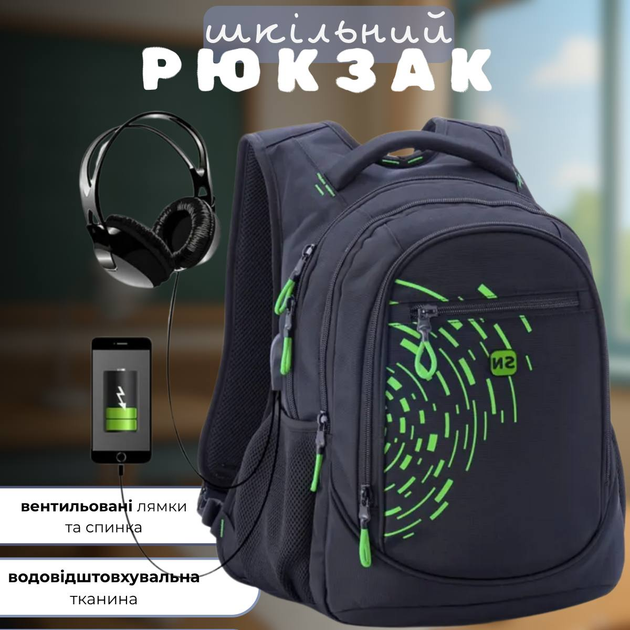 Шкільний рюкзак Winner/SkyName з USB-слотом для підлітків, чорний з зеленим, на 3 відділення Winner One/SkyName