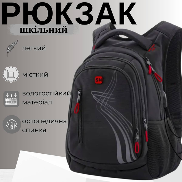 Шкільний рюкзак Winner/SkyName з USB-слотом для підлітків, чорний з червоним, на 3 відділення Winner One/SkyName