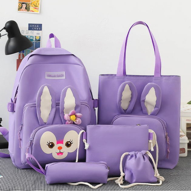 Шкільний рюкзак набір 5в1 для дівчинки 5-11 клас у комплекті сумка-шоппер клатч пенал Зайчик фіолетовий