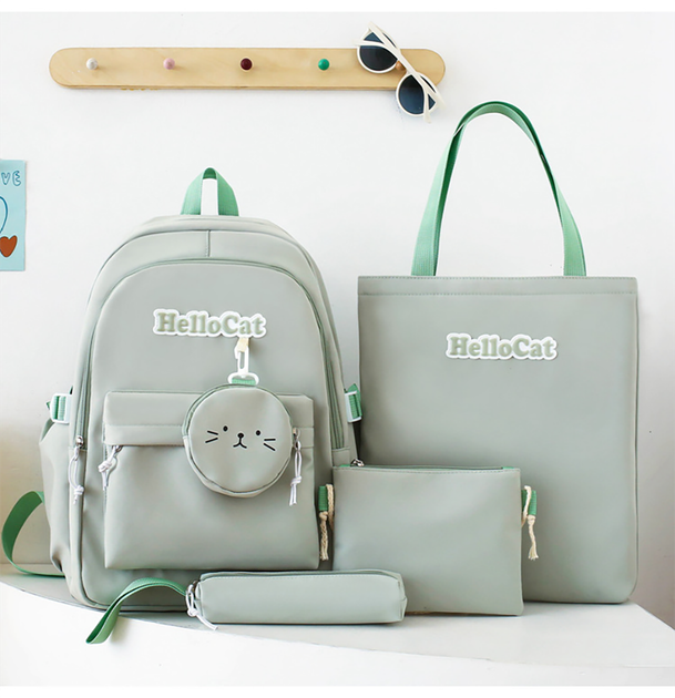 Шкільний рюкзак набір 5в1 для дівчинки 5-11 клас у комплекті сумка-шоппер клатч пенал Hello Cat зелений