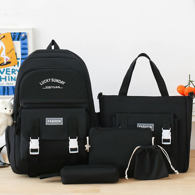 Шкільний рюкзак набір 5в1 для дівчинки 5-11 клас у комплекті сумка-шоппер клатч пенал LUCKY SUNDAY чорний