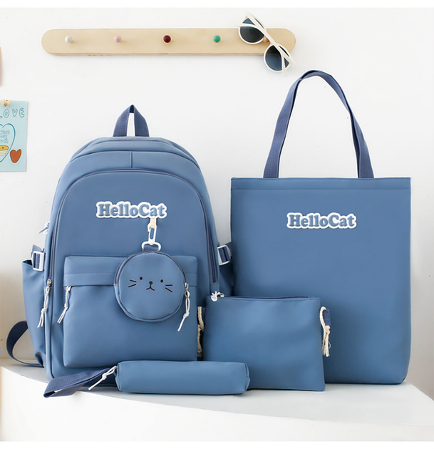 Шкільний рюкзак набір 5в1 для дівчинки 5-11 клас у комплекті сумка-шоппер клатч пенал Hello Cat блакитний