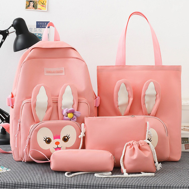 Шкільний рюкзак набір 5в1 для дівчинки 5-11 клас у комплекті сумка-шоппер клатч пенал Зайчик рожевий