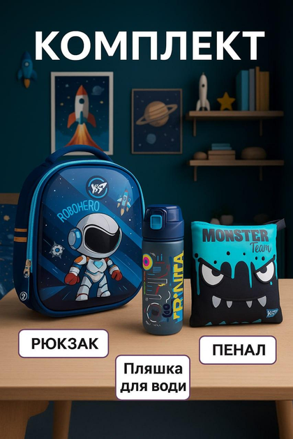 КОМПЛЕКТ Рюкзак дитячий для садочка Robohero K-33 Yes (550018)+Пляшка для води YES Blaster 620 мл (707795)+Пенал-органайзер