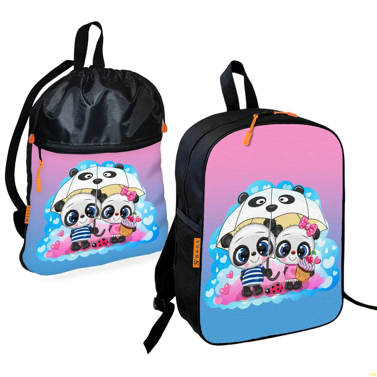 Шкільний рюкзак дитячий Панди під парасолькою + Сумка для взуття спортивної форми рюкзак-мішок хлопчикові (01920)