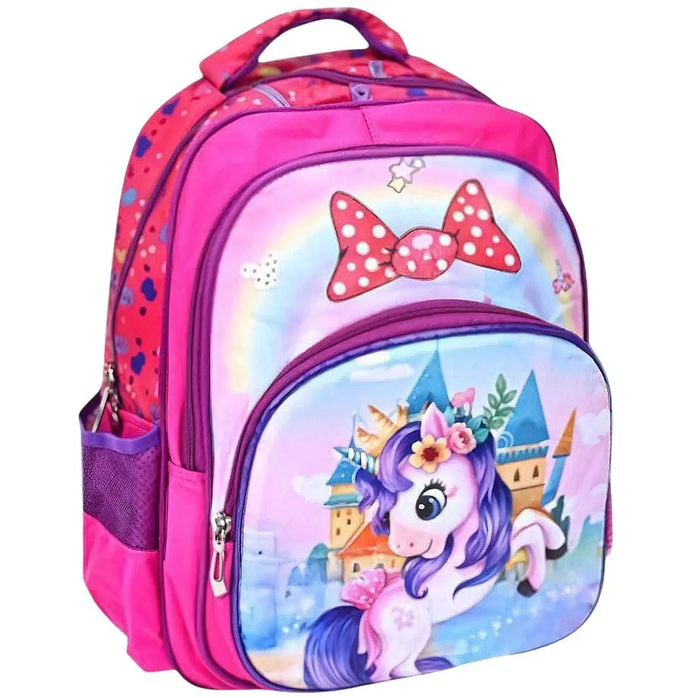Дитячий рюкзак FG240502003A з двома відділеннями та зовнішньою кишенею, рожевий з принтом єдинорога