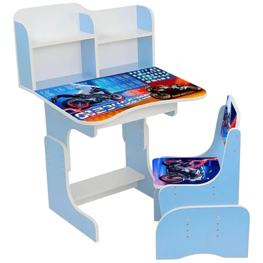 Дитяча парта Мотоцикли ПШ039 ЛДСП 69×45 см зі стільцем і пеналом блакитна
