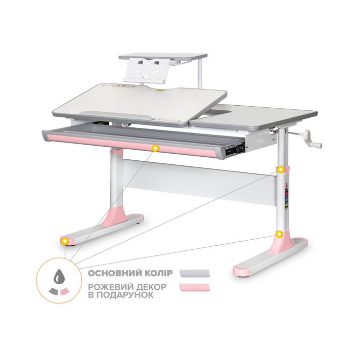 + 332 балів ITbox, Кількість місць - одномісні, Призначення - дитяча, шкільна, для дому, Вік - від 5 років, Ширина парти - 110 см, Глибина парти - 66 см, Висота парти - 50 - 77 см, Матеріал - метал, ДСП, Колір - білий, сірий, рожевий