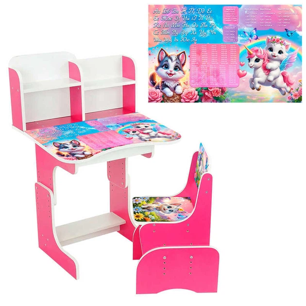 Парта шкільна "Кошенята з поні" ПШ055 ЛДСП, колір малинова, 69*45 см, + 1 стілець, з пеналом