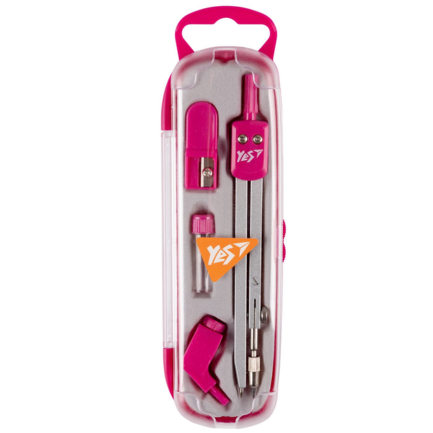 Циркуль YES 220096 у пласт. футлярі, 4 предмети (циркуль+чинка+стрижні+тримач д/олівця), розовий /220096/
