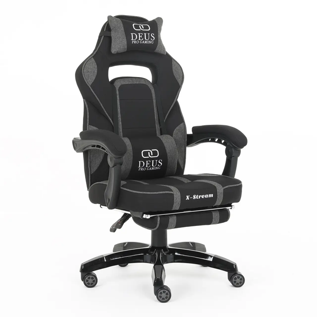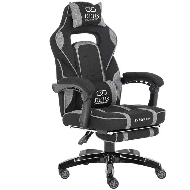 Ігрове спортивне крісло із тканини Deus Чорно-світло-сіре комп'ютерне крісло для геймерів та роботи