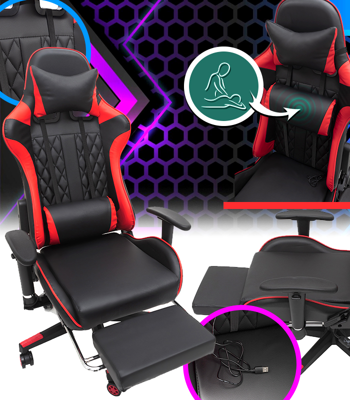 Геймерське комп'ютерне крісло з масажером, ергономічними подушками та підставкою для ніг, Чорний/Червоний (G899) G899