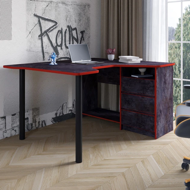 Геймерський комп'ютерний стіл LION Буст кутовий з шухлядами Бетон темний/Червоний (LION-041465)