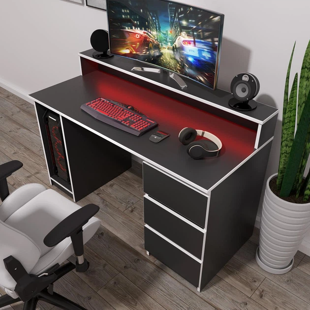 Стіл комп'ютерний ігровий Геймер з підсвічуванням Чорний з білою кромкою 1300x750/900x600 мм (арт. SKRZ2000-064)