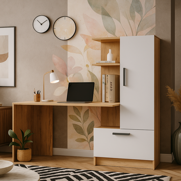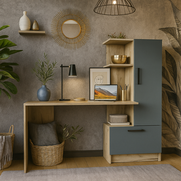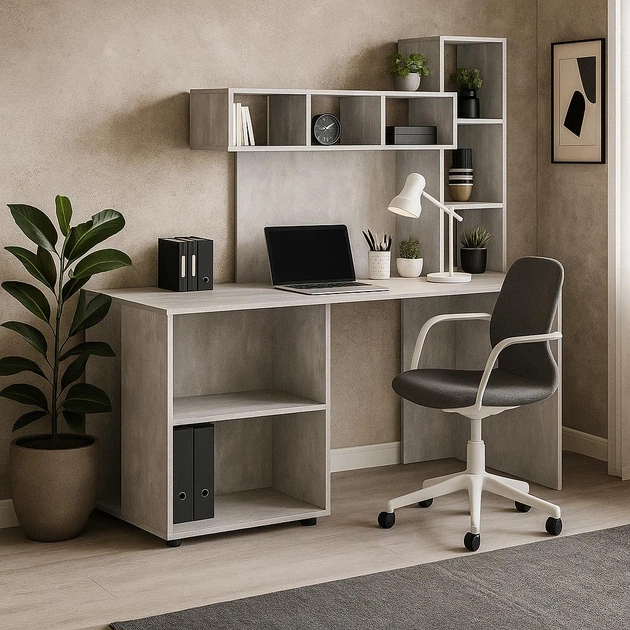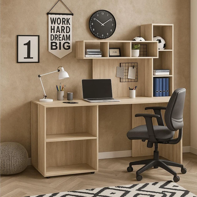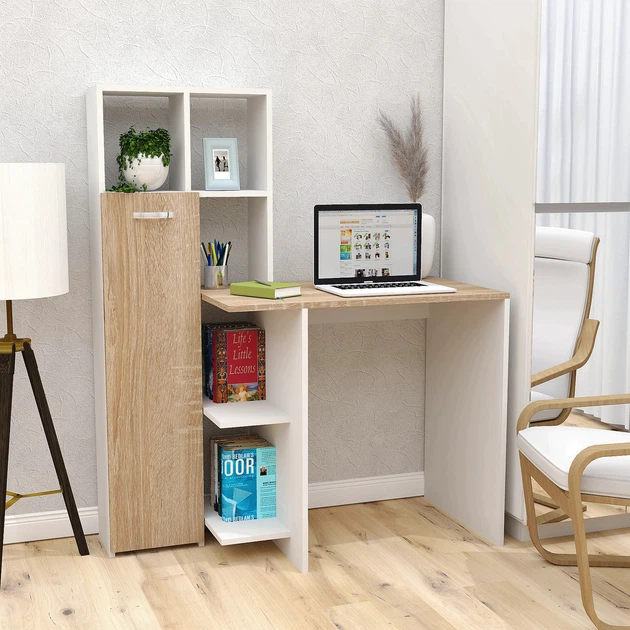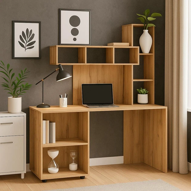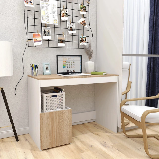 Невеликий сучасний стильний прямий письмовий комп'ютерний стіл для ноутбука з відкритими полицями та пеналом для підлітка шк