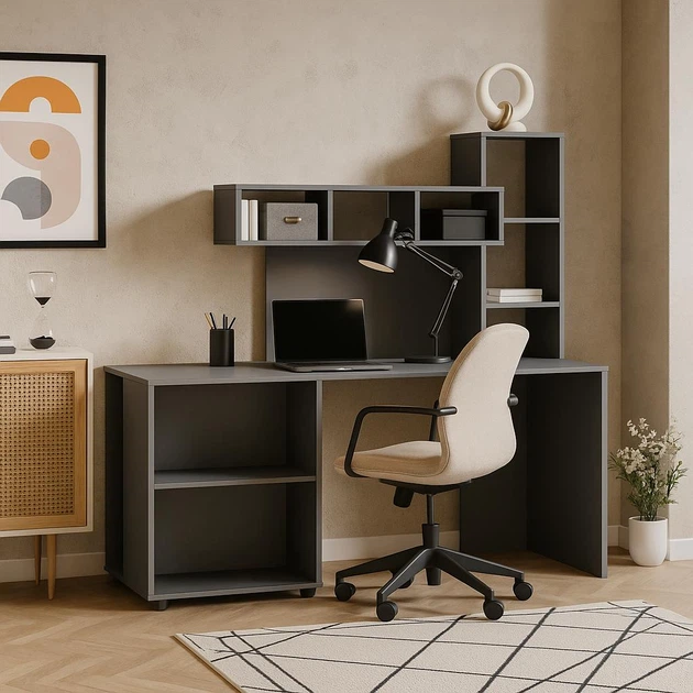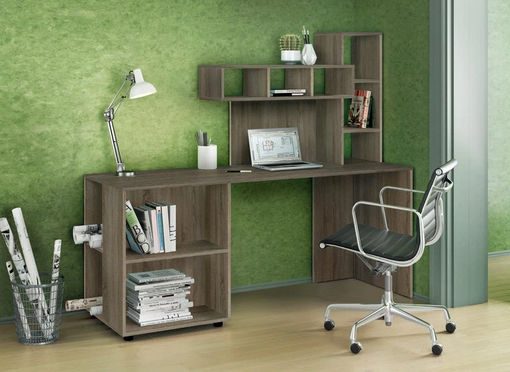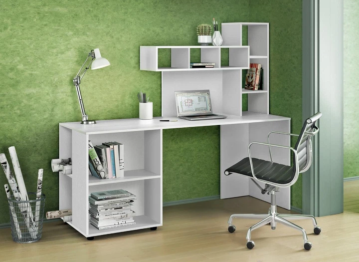 Великий сучасний стильний комп'ютерний письмовий стіл з надбудовою та відкритими полицями для книг в стилі модерн в дитячу с