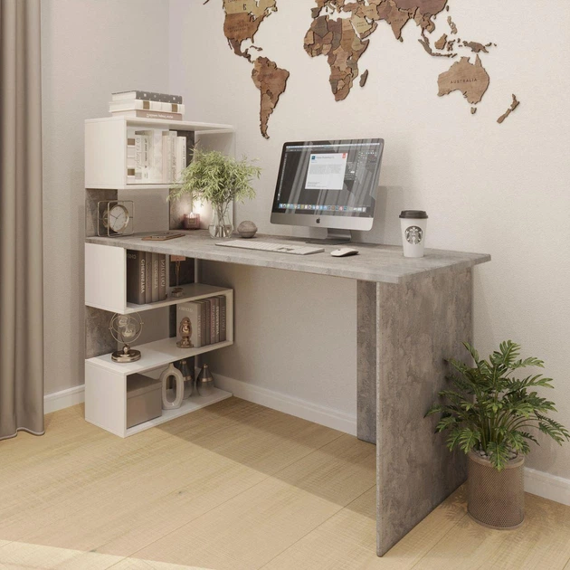 Комп'ютерний стіл ЛДСП зі стелажем з лівої сторони 141.6х122.6х60 см Бетон/Білий