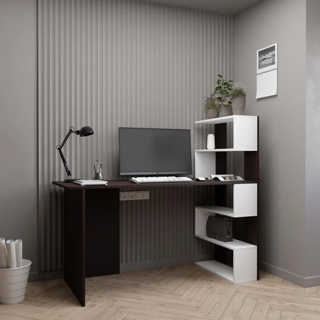 Письмовий стіл кутовий ламінована ДСП з полицями 141.6х122.6х60 см Венге/Білий