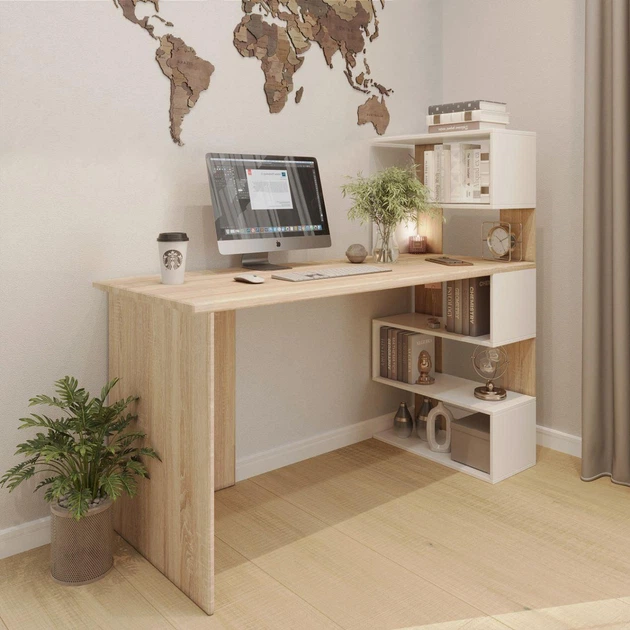Письмовий стіл кутовий ламінована ДСП з полицями 141.6х122.6х60 см Сонома/Білий