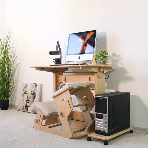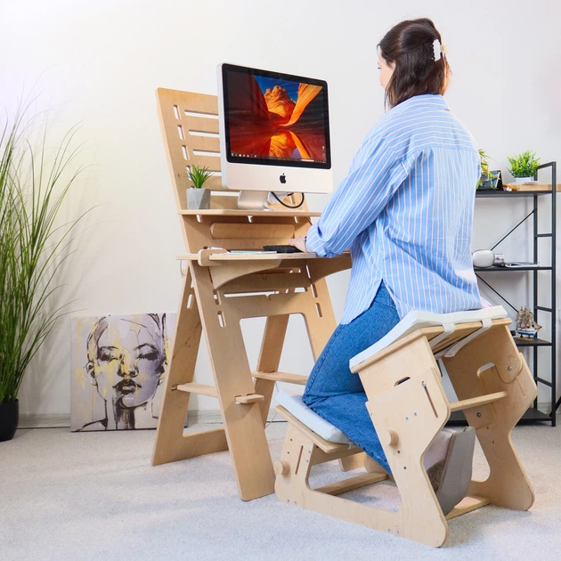 Комплект стіл комп'ютерний трансформер для роботи стоячи або сидячи ТО-1 натуральний + стілець колінний ТО-7 з регулюванням