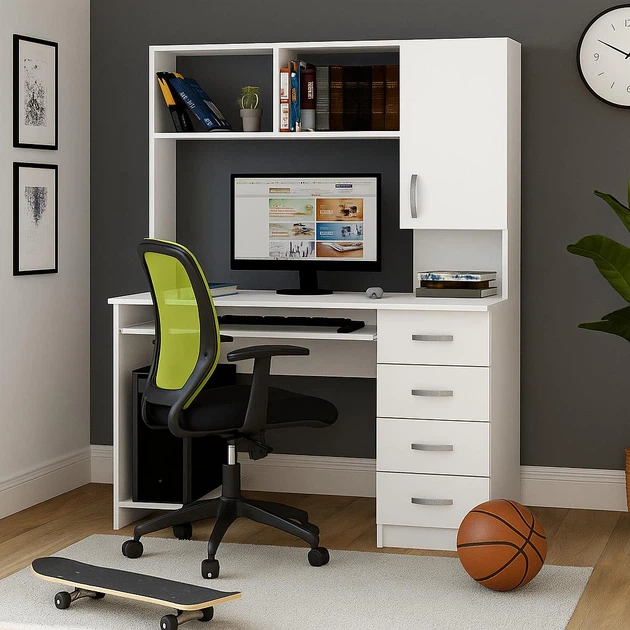 Сучасний великий білий письмовий комп'ютерний стіл для ПК з надбудовою тумбою з шухлядами і полицею для системного блоку та
