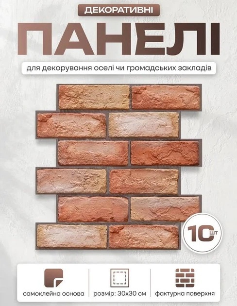 Самоклеючі 3d панелі під цеглу 10шт по 30 х 30 см, у ванну, кухню, вітальню, спальню або для балкона