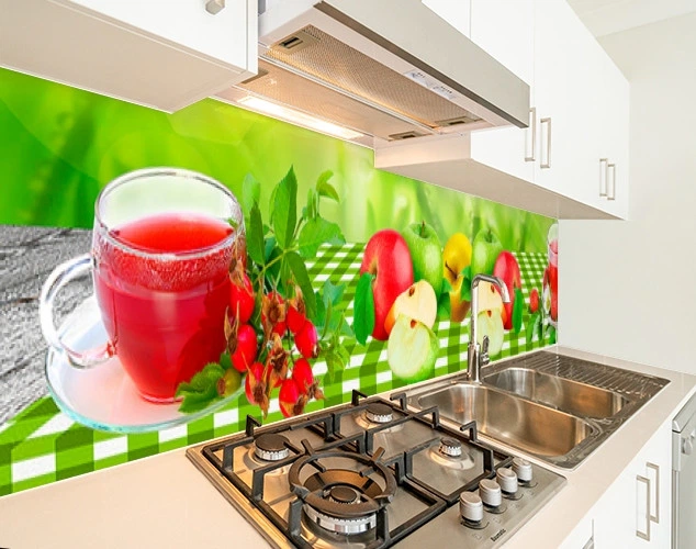 Кухонний фартух замінник скла яблука на столі з чаєм, на двосторонньому скотчі 68 х 305 см (ПЭТ3-sed617-6)