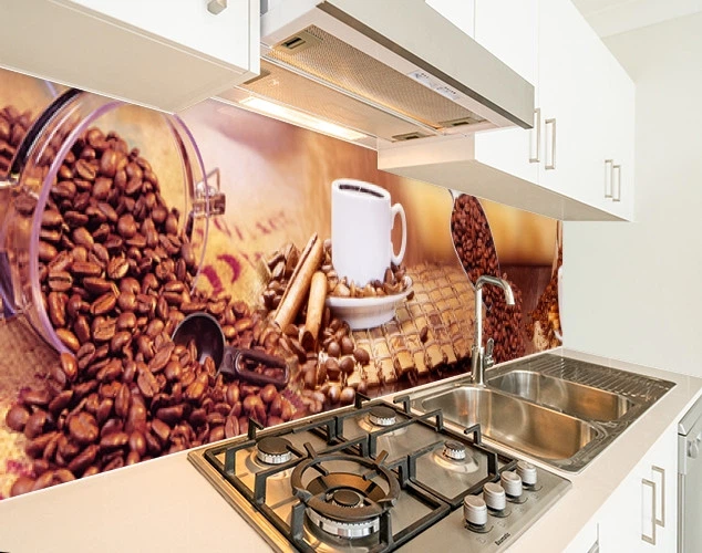Панель на кухонний фартух під скло кавові зерна з чашками, з двостороннім скотчем 62 х 305 см, 1,2 мм (ПЭТ-sed638-5)