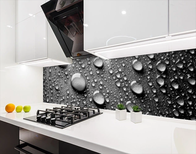 Кухонний фартух замінник скла краплі дощу чорно білі, з двостороннім скотчем 62 х 410 см, 1,2 мм (ПЭТ-stx227)