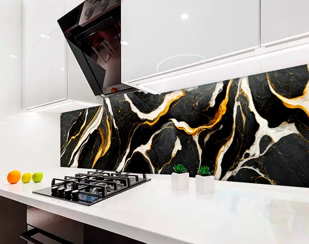 Кухонна панель жорстка ПЕТ мармур чорний із золотом та білим, з двостороннім скотчем 62 х 410 см, 1,2 мм (ПЭТ-stx330)
