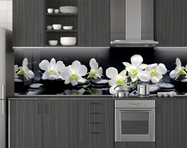 Панелі на кухонний фартух ПЕТ орхідеї на каменях, з двостороннім скотчем 62 х 410 см, 1,2 мм (ПЭТ-sfl11567)