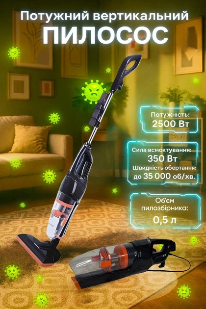 Вертикальний акумуляторний пилосос Crownberg СВ-674 з контейнером 0.5л сухе прибирання 2500Вт Чорний/Синій