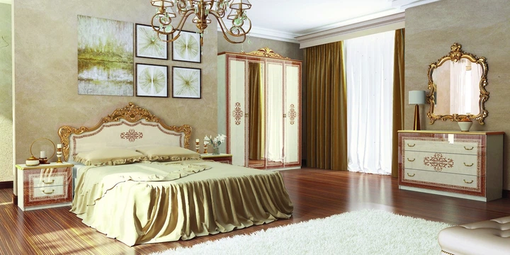 Спальний гарнітур Дженіфер 1 MiroMark Радика беж (ламінована ДСП) (двоспальне ліжко 160x200/ тумби/комод/дзеркало/шафа 4Д з