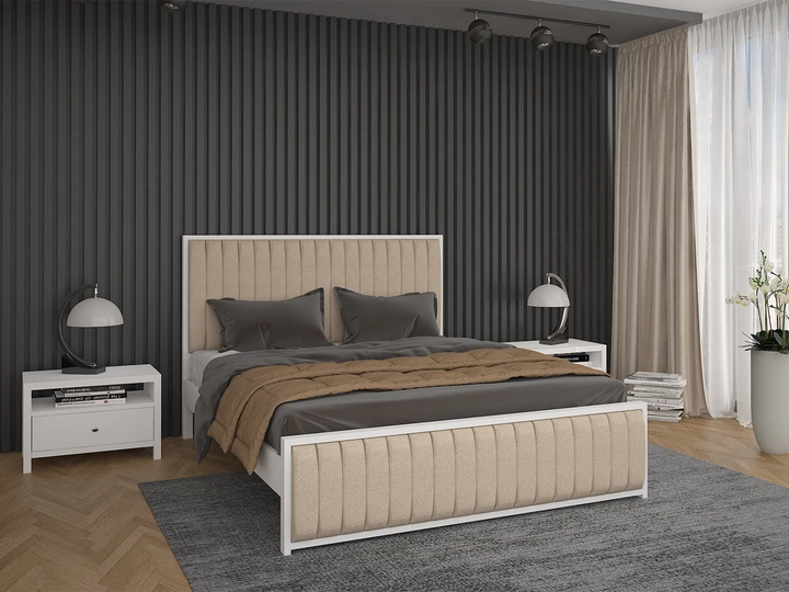 Ліжко двоспальне з м'яким узголів'ям Відень 180х200 MebiGrand Білий/Бежевий (натуральне дерево/тканина Аляска 23) (з ламелям