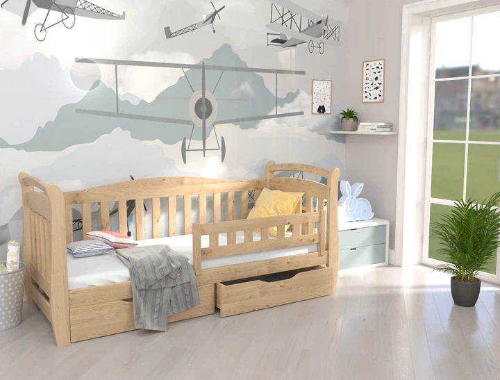 Ліжко односпальне в дитяче з натурального дерева Домінік 90х200 з бортиком та ящиками вільха Luna (без матраца)