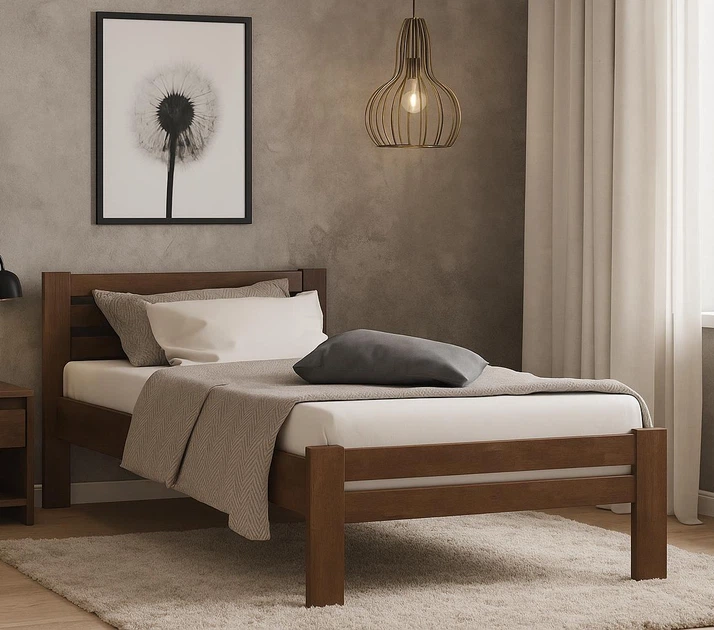 Сучасне ліжко односпальне дерев'яне 90х200 см з масиву бука в кольорі горіх з ламелями з ортопедичною основою на ніжках для