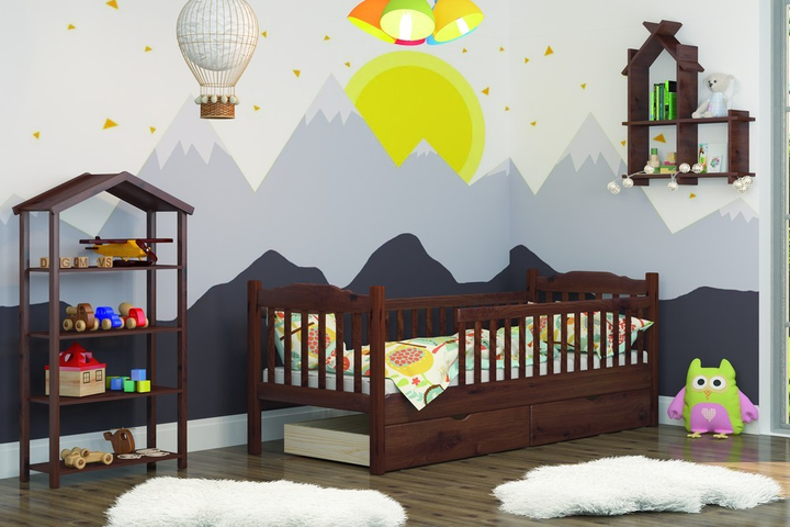 Ліжко в дитячу кімнату з натурального дерева односпальне з бортиком і ящиками ТМ ЛУНА Вінні 80х200 горіх темний (без матраца
