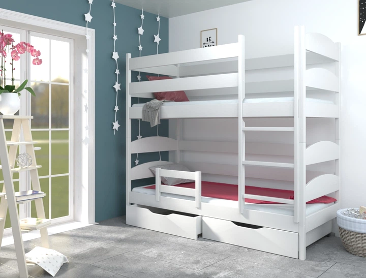 Ліжко двоярусне з натурального дерева Лаккі 80х200 з бортиком та ящиками білий Luna (без матраца)