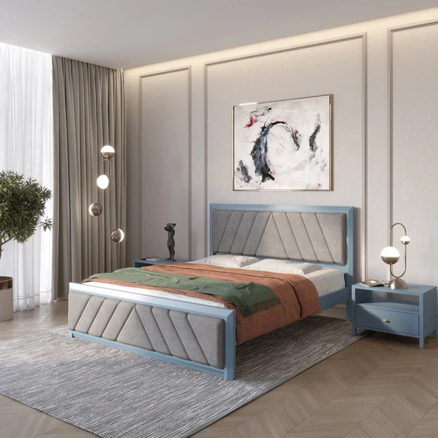 Односпальне дерев'яне ліжко Mebigrand Барселона Б2 Сіро-синій (S7010R90B)/Аляска 23 (Бежевий) 90х200 см (MBG-12567)