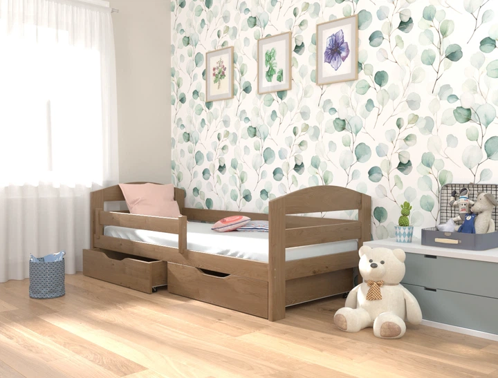 Ліжко односпальне в дитяче з натурального дерева Вінні 90х200 з бортиком та ящиками горіх світлий Luna (без матраца)