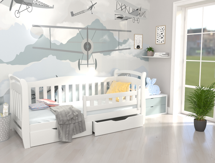 Ліжко односпальне в дитячу з натурального дерева 90х190 з бортиком та ящиками (без матраца) ТМ ЛУНА Домінік білий