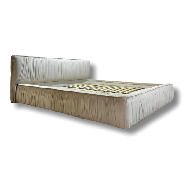 Ліжко двоспальне м'яке на подіумі MeBelle PUFFIE 160х200 см, софт зефірка шарпей, світло-бежевий велюр
