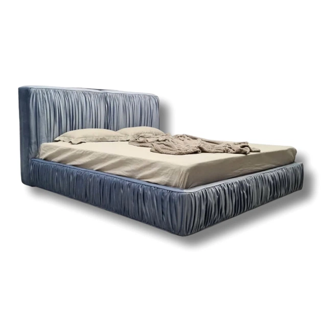 Трендове двоспальне ліжко софт м'яке на подіумі MeBelle PUFFIE-2 160х200 см, стиль шарпей, блакитний велюр
