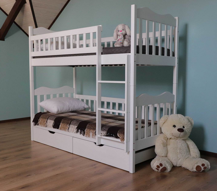 Ліжко двоярусне з натурального дерева Адель Дуо 90х200 з бортиком та ящиками білий Luna (без матраца)
