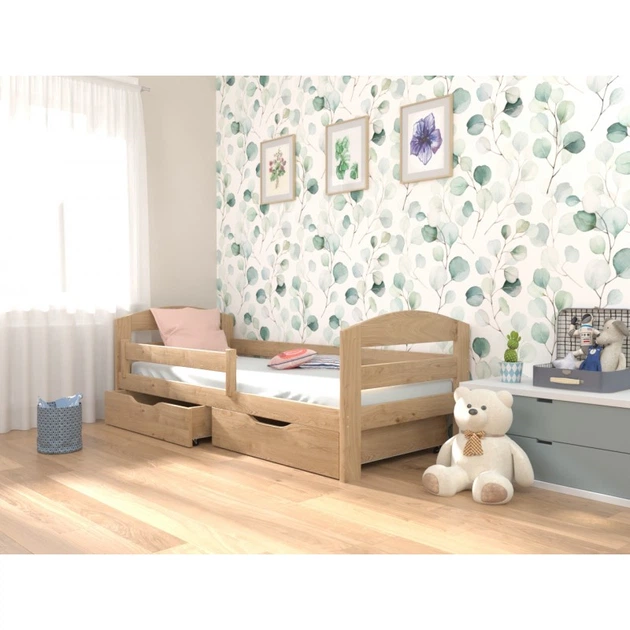 Ліжко односпальне в дитячу з натурального дерева 80х160 з бортиком та ящиками (без матраца) ТМ ЛУНА Вінні горіх світлий