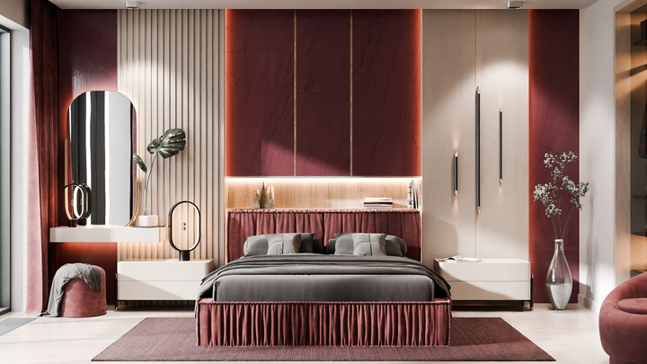 Ліжко двоспальне з підйомним механізмом з м'яким узголів'ям 180x200 Ванесса 3 Світ Меблів Бордовий (ДСП/Тканина Велюр Багіра