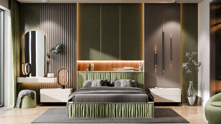 Ліжко двоспальне з підйомним механізмом з м'яким узголів'ям 180x200 Ванесса 3 Світ Меблів Оливковий (ДСП/Тканина Велюр Багір